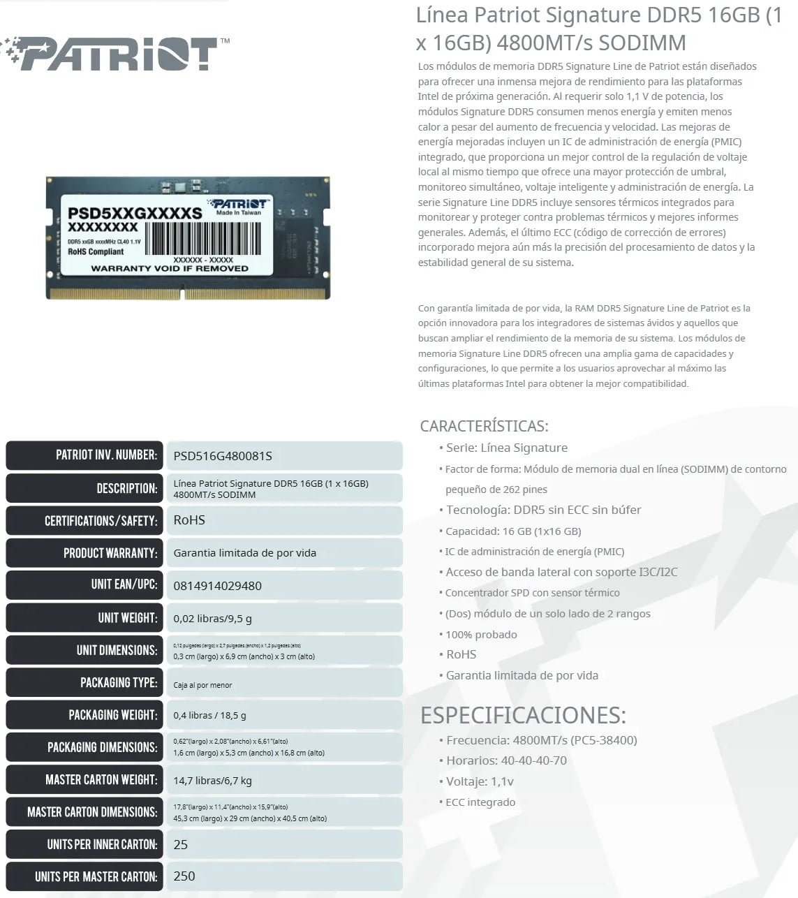Memoria RAM SODIMM PATRIOT Signature Line PSD516G480081S / 16GB / DDR5 4800MHz / CL40 / 1.1V / Para Laptop / Negro