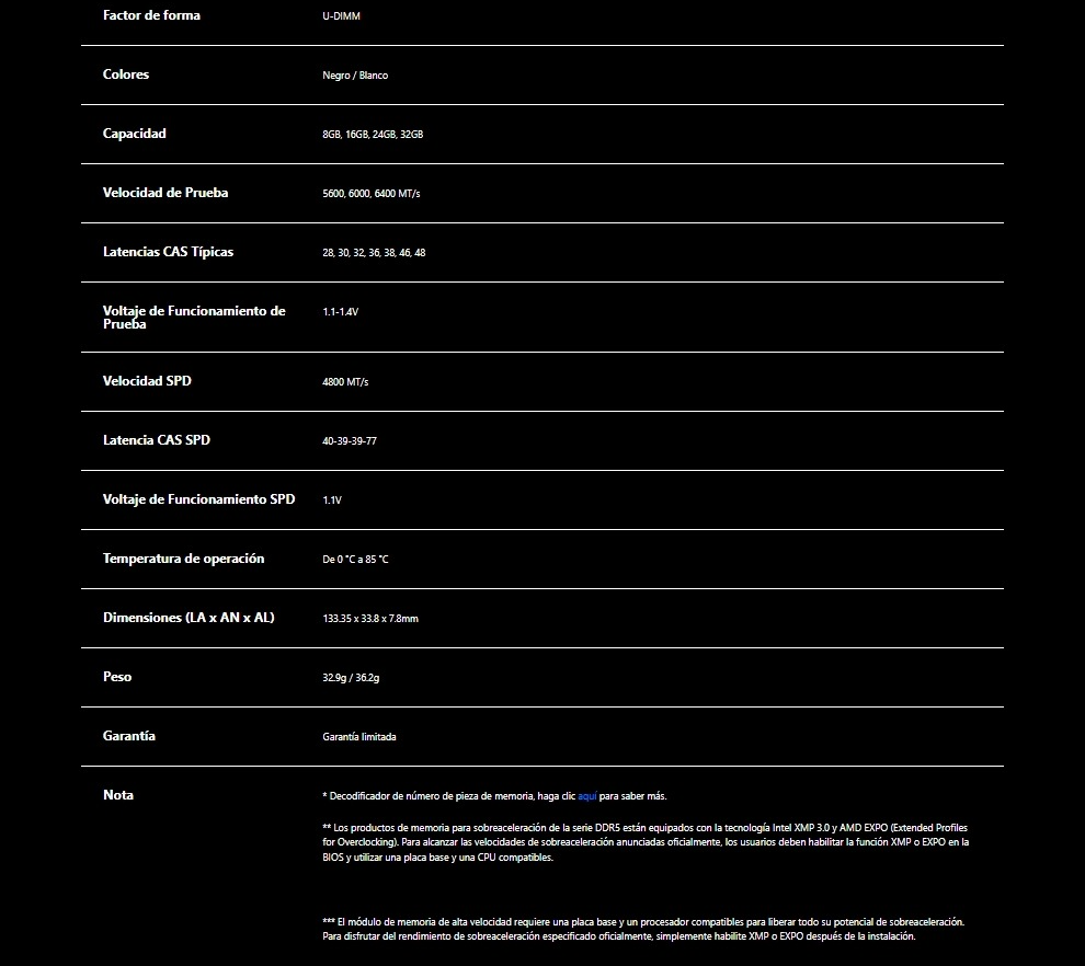 Memoria RAM XPG Lancer Blade DDR5 – 8GB, DDR5 5600MHz, CL46, XMP/EXPO, Negro