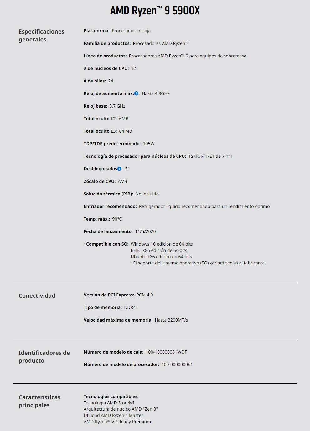 Procesador AMD RYZEN 9 5900X / Am4 / 12 Nucleos / 24 Hilos / 3.7-4.8GHZ / 105W / SIN GRAFICOS / SIN DISIPADOR / 100-100000061WOF