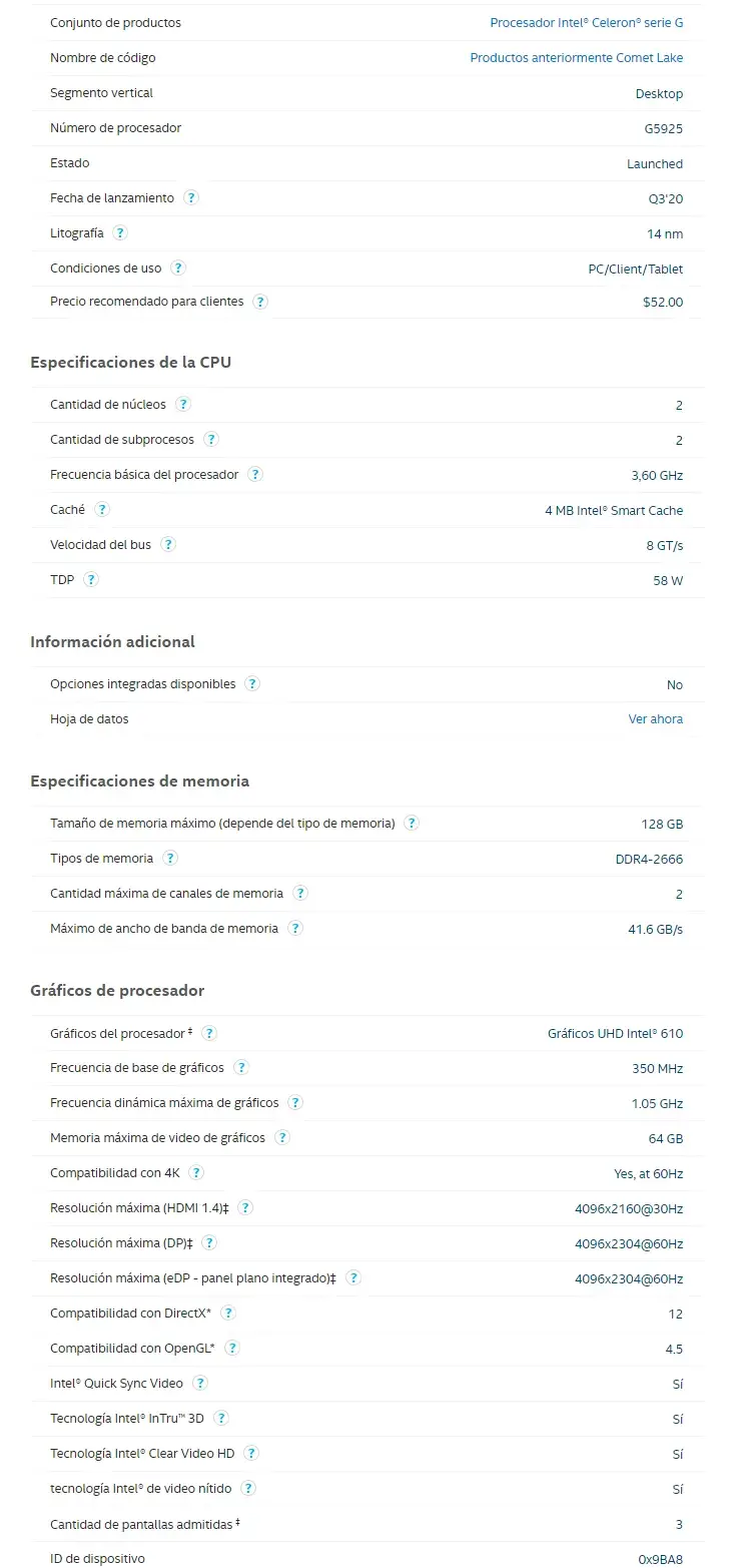 Procesador Intel Celeron G5925 Intel UHD Graphics 610, S-1200, 3.60GHz, Dual-Core, 4MB SmartCache (10ma Generación – Comet Lake) SKU: BX80701G5925.