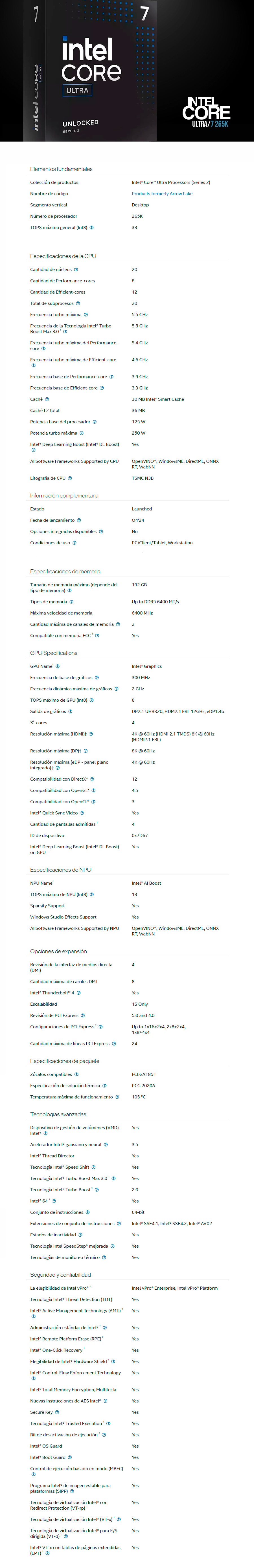 Procesador Intel Core Ultra 7 265K / LGA1851 / 20 Núcleos / 8P+12E / Turbo Máximo 5.5 GHz / Intel Graphics / 125w / 30MB Caché – Ultra Series 2 Arrow Lake – Sin Disipador