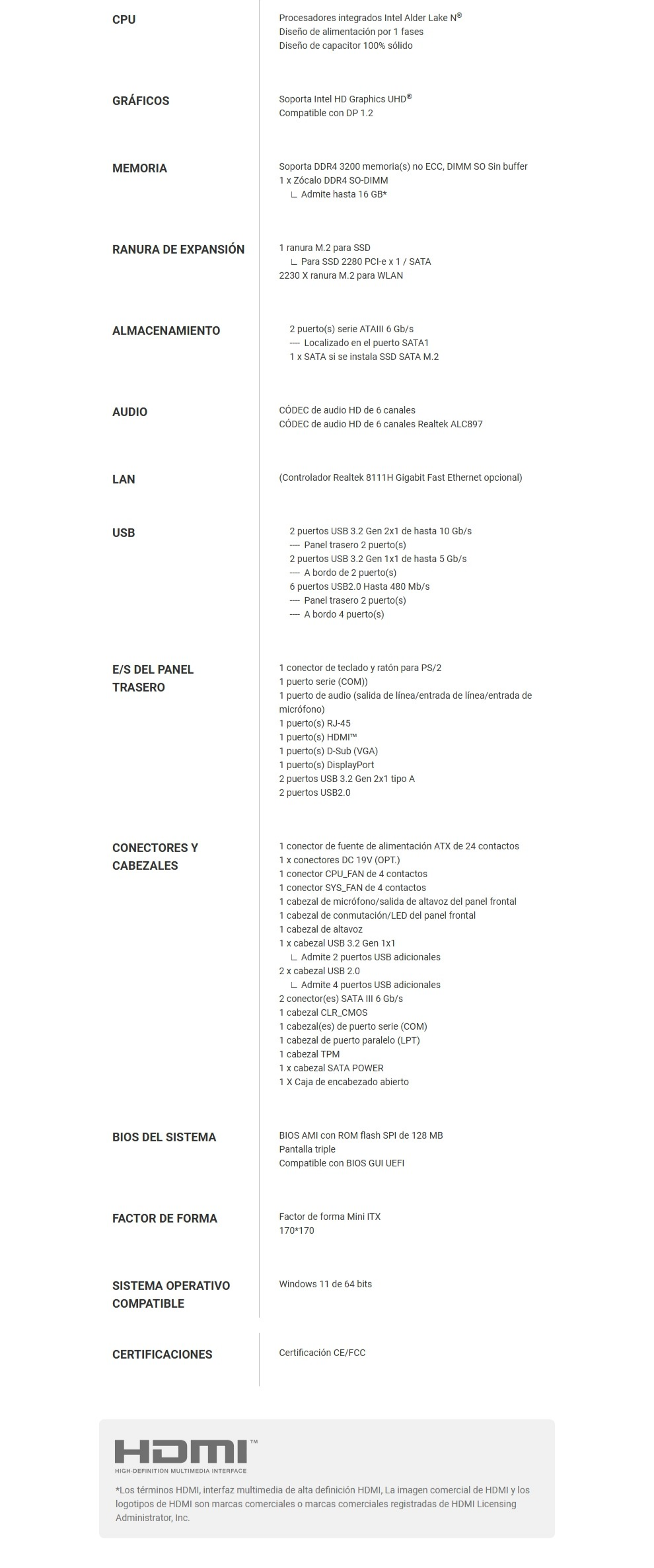 Tarjeta Madre ECS 89-206-Qb5109 – CPU Intel Alder Lake N, Soporta DDR4 3200 Hasta 16GB SO-DIMM, Hdmi, Vga, DP, Puerto Para SSD 2280 PCI-e – Mini Itx