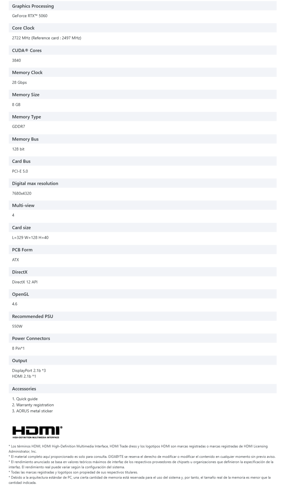 SKU: GV-N5060AORUS E-8GD Categoría: