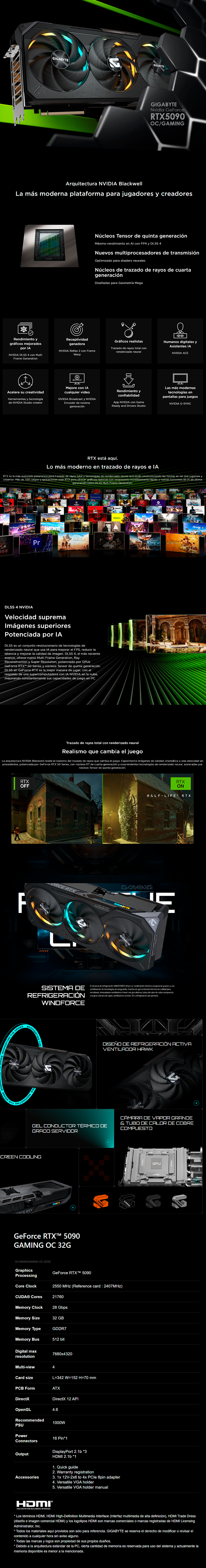 Tarjeta De Video Gigabyte GeForce RTX 5090 Gaming Oc 32g, 32Gb GDDR7, 512 Bit, 2550 MHz, Núcleos Cuda 21760, 16 pines *1, PCI-E 5.0