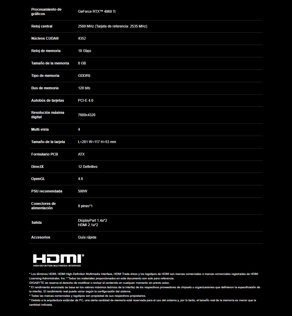 Tarjeta De Video GIGABYTE RTX 4060 TI GAMING OC 8G / 8GB GDDR6 / 128 Bits / Núcleos Cuda 4352 / PCI Express Gen 4 / X2 Hdmi, X2 Dp / X1 8Pin