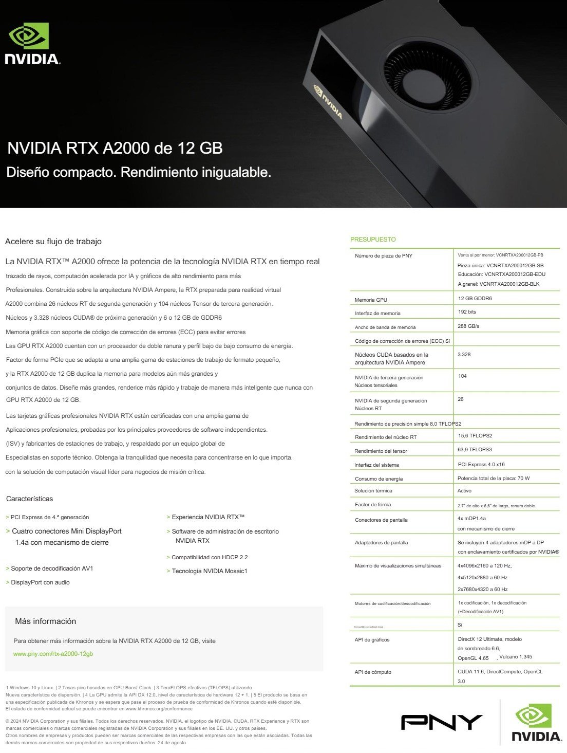 Tarjeta De Video PNY NVIDIA QUADRO RTX A2000 / 12GB GDDR6 / 192 Bits / Núcleos CUDA 3328 / X1 HDMI, X3 DP / PCI Express 4.0 x16