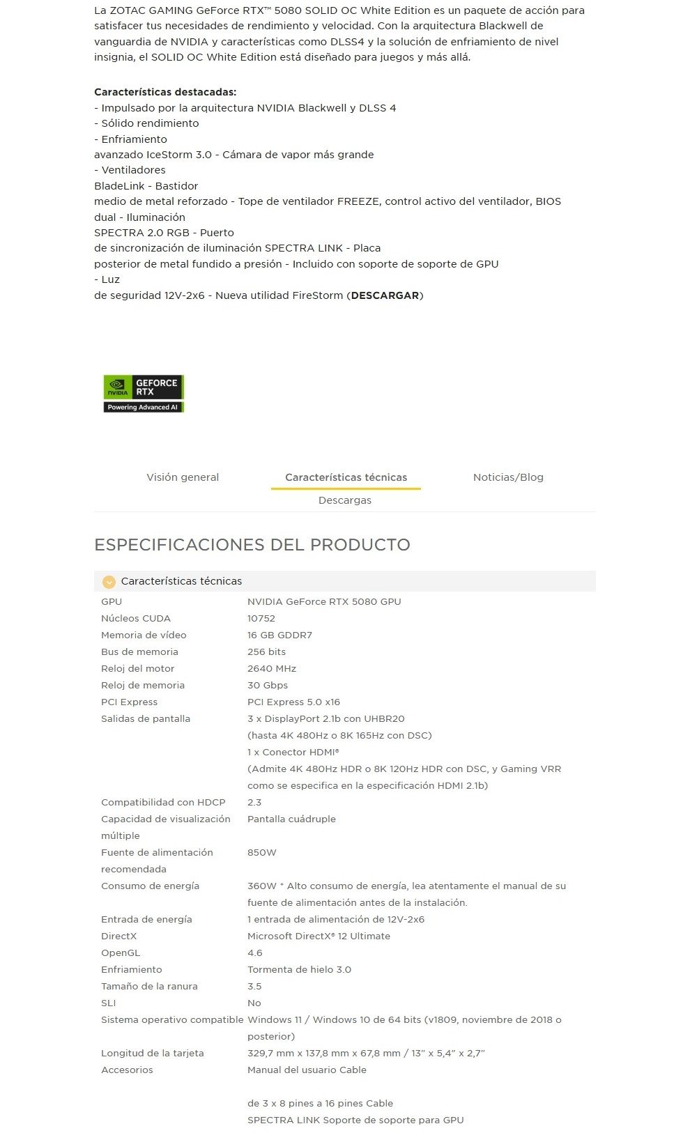Tarjeta de Video Zotac NVIDIA Gaming GeForce RTX 5080 Solid OC – 16GB GDDR7, 256-bit, PCI Express x16 5.0
