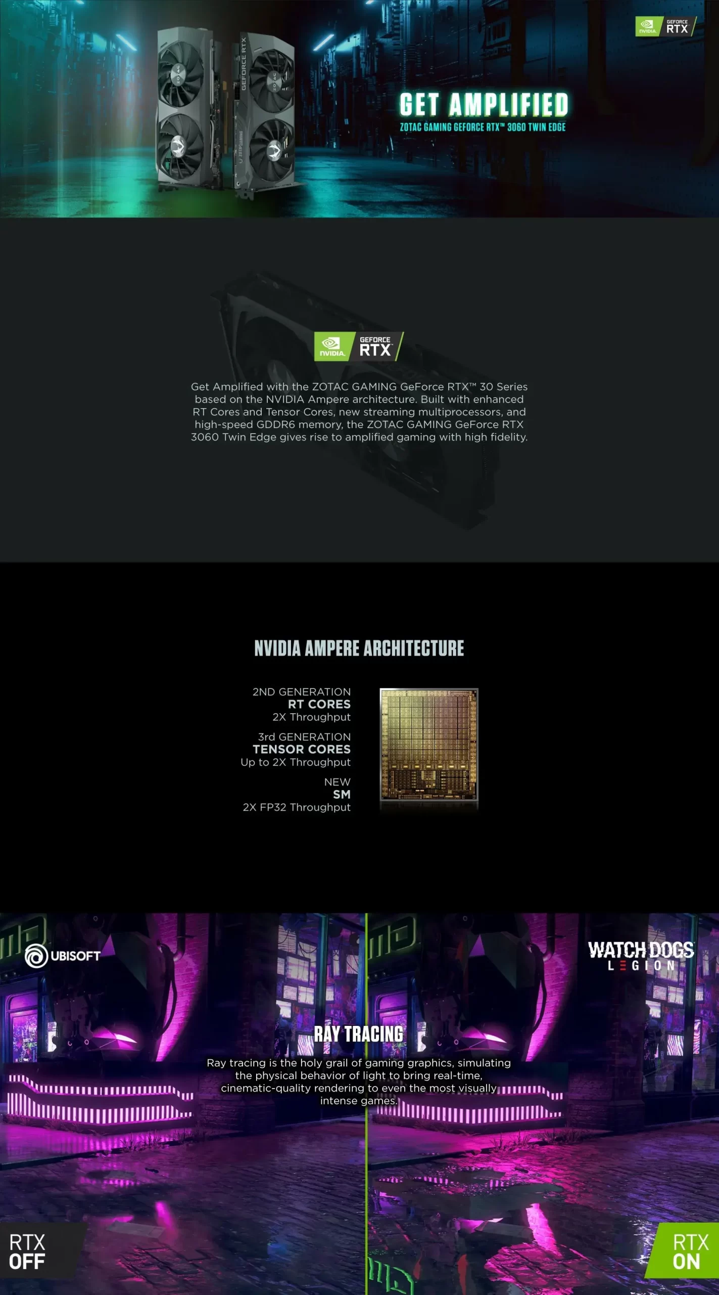 • Amplifica con la serie ZOTAC GAMING GeForce RTX™ 30 basada en la arquitectura NVIDIA Ampere. Construido con núcleos RT y núcleos Tensor mejorados, nuevos multiprocesadores de transmisión y memoria GDDR6 de alta velocidad, el ZOTAC GAMING GeForce RTX 3060 Twin Edge da lugar a juegos amplificados con alta fidelidad.