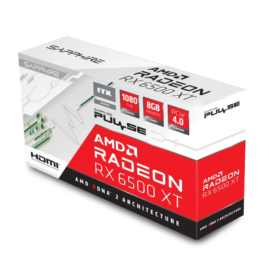 Tarjeta De Video SAPPHIRE PULSE AMD Radeon RX 6500 XT ITX PURE / 8GB GDDR6 / 64 Bit / Procesadores Stream 1024 / X1 HDMI, X1 DP / PCI Express 4.0 / X1 8Pin