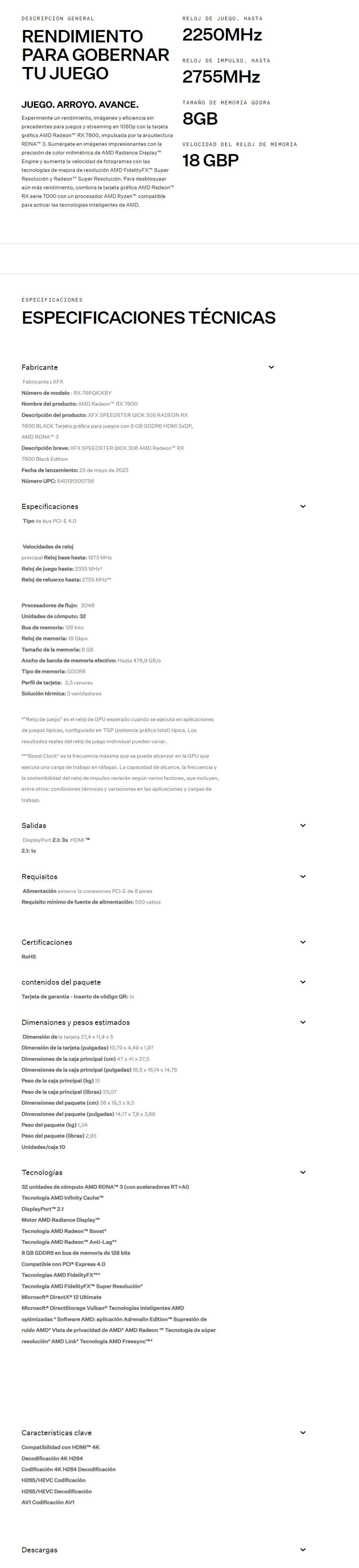 Tarjeta De Video XFX SPEEDSTER QICK308 Radeon RX7600 / 8GB GDDR6 / Núcleos Cuda 2048 / 128Bit / X3 Dp, X1 Hdmi / PCI-E 4.0 / 8-pin x1 / Boost 2755 MHz