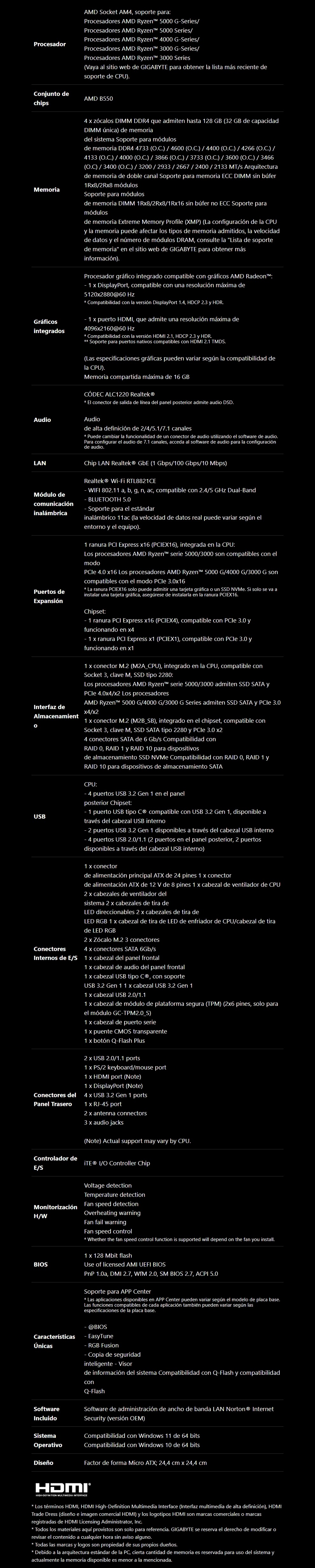 Tarjeta Madre GIGABYTE B550M DS3H AC – AMD Socket AM4, Micro-ATX, 128GB x4 DDR4 4733Mhz OC*, Hdmi, Dp, Vga, Wifi, Bluettoth – M.2 PCIe 4.0
