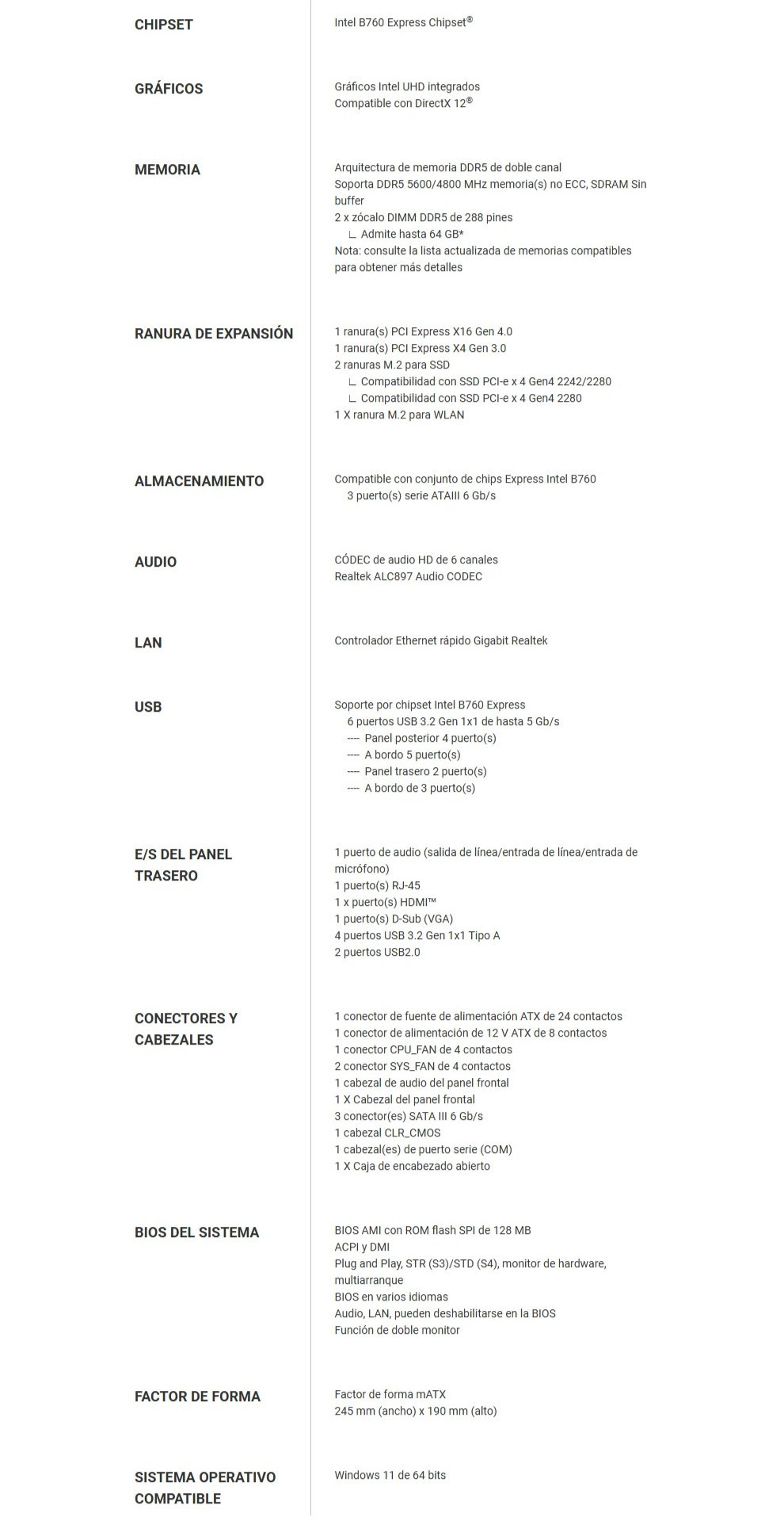 Tarjeta Madre ECS B760H7-M2 – Socket 1700, 64GB X2 DDR5 5600Mhz, Hdmi, Vga, M.2 PCIe 4.0, USB 3.2 – Micro-ATX