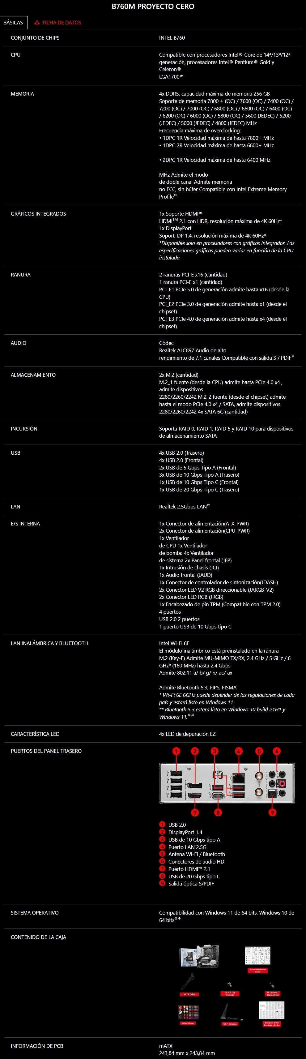 Tarjeta Madre MSI B760m Project Zero / Micro-ATX / LGA1700 / X4 256 GB DDR5 7800 MHz / HDMI, USB 2.0, USB-C, 3.5 MM, RJ-45 / Negro