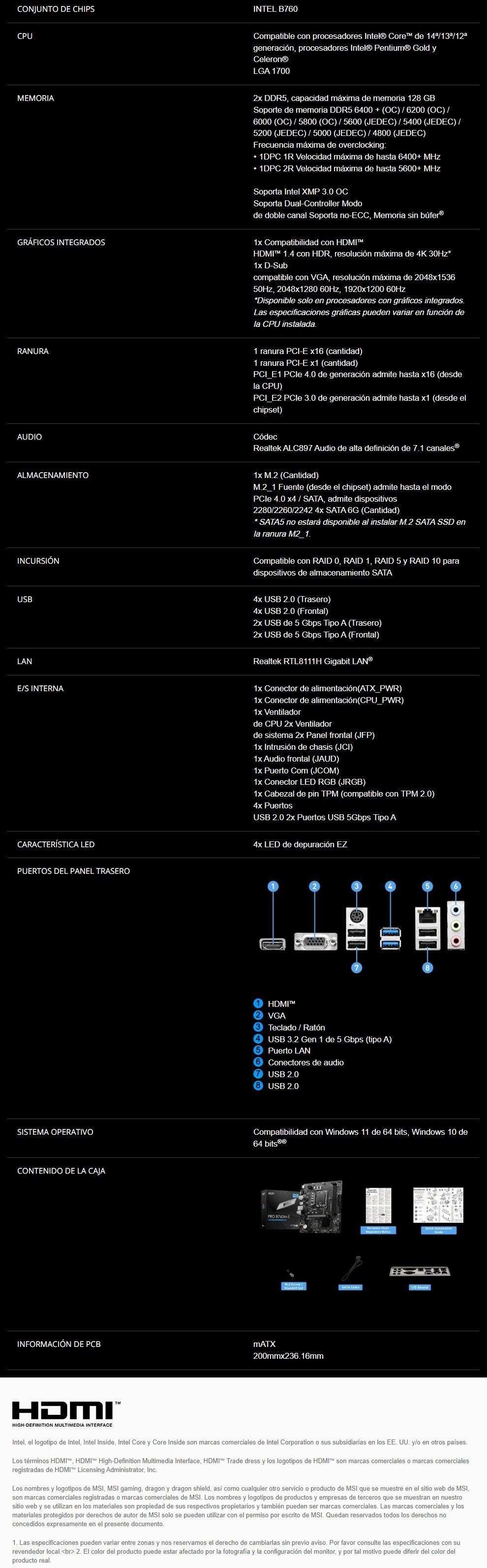 Tarjeta Madre MSI PRO B760M-E / M-ATX / Socket LGA1700 14ª / 128GB X2 DDR5 6400MHz / HDMI, VGA / USB Tipo A / x1 M.2 PCle 4.0*