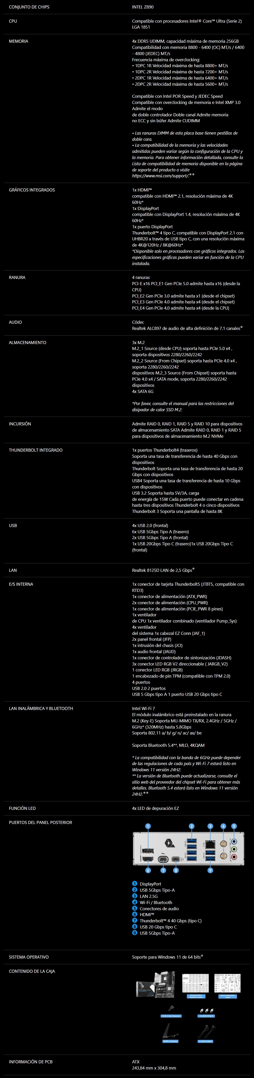 Tarjeta Madre MSI PRO Z890-S WIFI – INTEL Socket LGA 1851, ATX, 256GB X4 DDR5 8800Mhz OC*, Hdmi, Dp, M.2 PCI-e 5.0