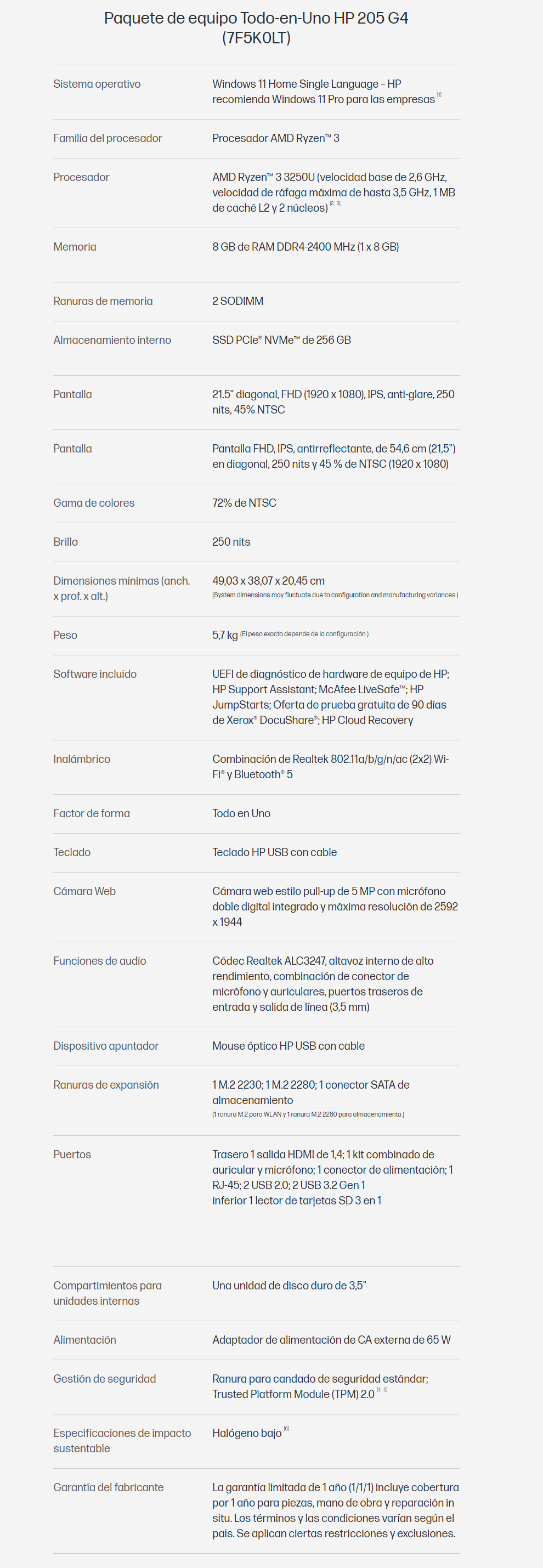 All In One HP 205 G4 / 21.5″ / AMD RYZEN 3-3250U / Boost hasta 3,5 GHz / Memoria Ram 8GB DDR4 (2 Ranuras) / SSD PCIe® NVMe™ 256GB / Windows 11 Home / Con Mouse Y Teclado HP / Negro