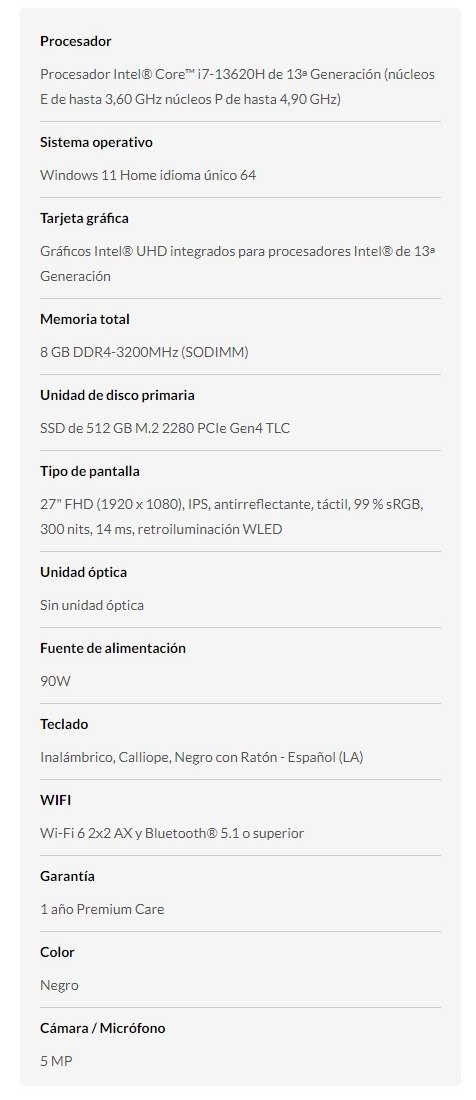 All in One LENOVO IdeaCentre AIO 3i 7ma Gen / 27″ / Pantalla FHD IPS Antirreflejante / Intel® Core™ i7-13620H / 8GB DDR4 3200MHz / Almacenamiento 512 GB SSD M.2 / USB, HDMI, RJ45, 3.5 MM / Windows 11 Home / Español / Color Negro