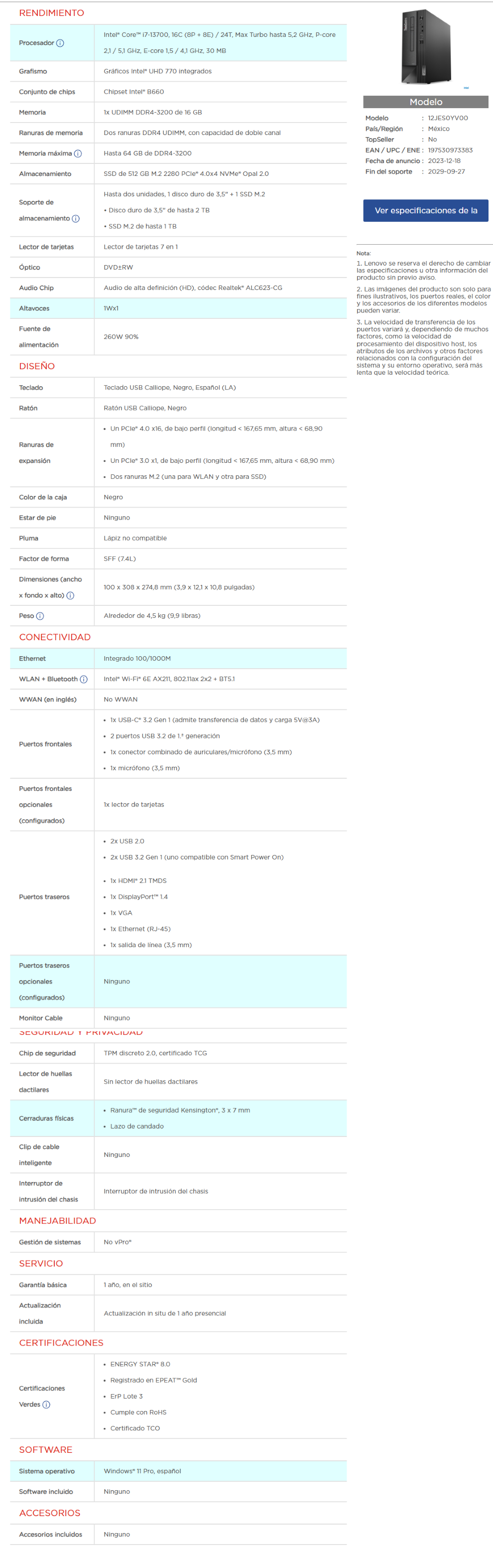 Computadora LENOVO Thinkcentre neo 50s GEN 4 / Intel® Core™ i7-13700 / Memoria RAM 16GB / Almacenamiento 512GB SSD / USB 3.2, USB-C, 3.5 MM, RJ-45, HDMI, VGA, DP / Windows 11 Pro / Español / Negro