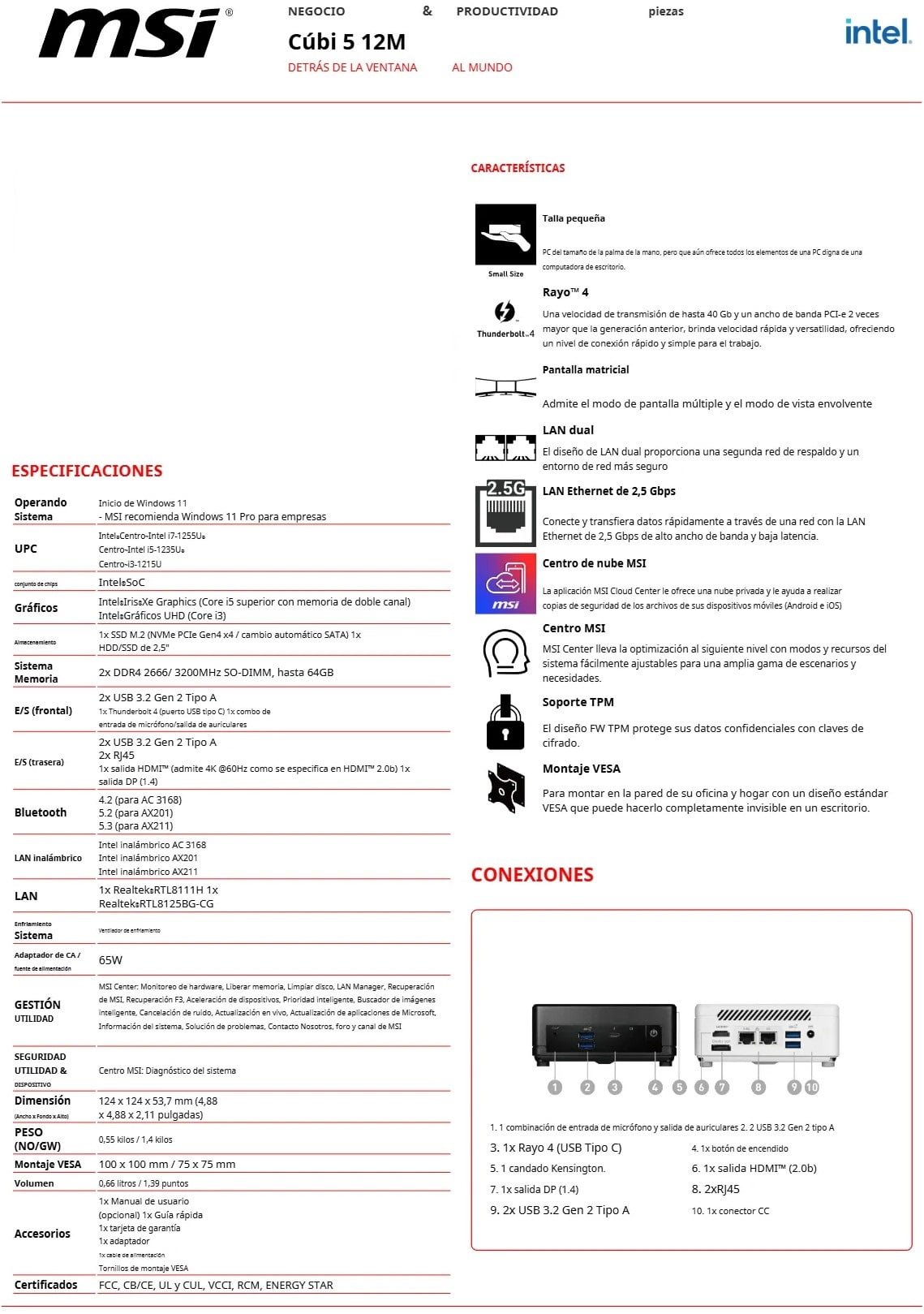 Mini PC MSI CUBI 5 12M / Intel Core I3-1215U / Gráficos UHD / RAM DDR4 2666MHz / SSD M.2 / Bluetooth / Windows 11 Home / Negro
