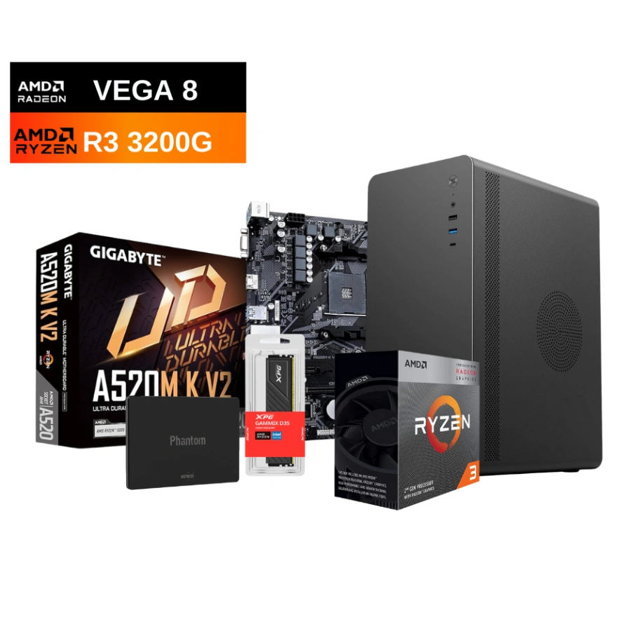 PC de Escritorio QUAPHAN – AMD Ryzen 3 3200g, Tarjeta Madre A520, DDR4 3200Mhz 8GB, SSD SATA 240GB, 500W Incluido En El Gabinete, Licencia Windows 11/Office2024