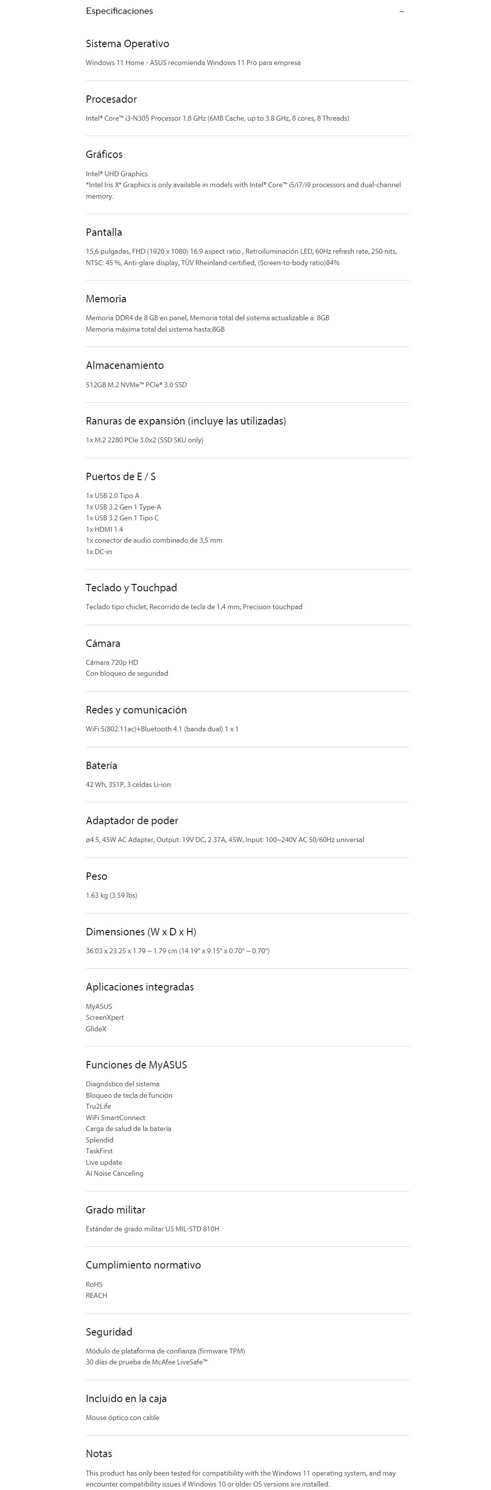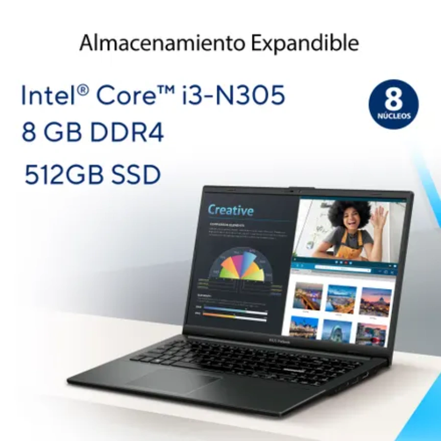 Laptop ASUS Vivobook Go 15 15.6″ Full HD / Intel Core i3-N305 1.80GHz / Memoria Ram 8GB DDR4 / 512GB SSD / Windows 11 Pro / Español / Negro