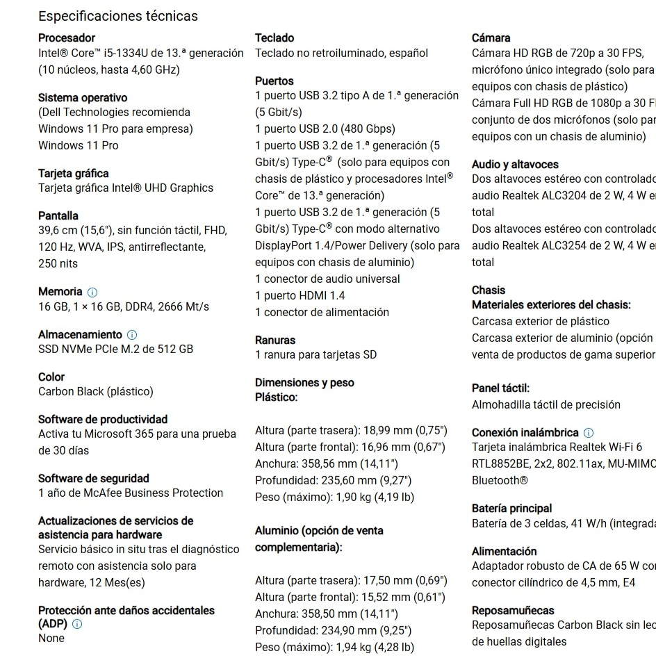 Laptop DELL 15 DC15250 – 15.6″, Intel Core i5-1334U, RAM 16GB, Almacenamiento NVMe M.2 512GB, Windows 11 Pro – Español