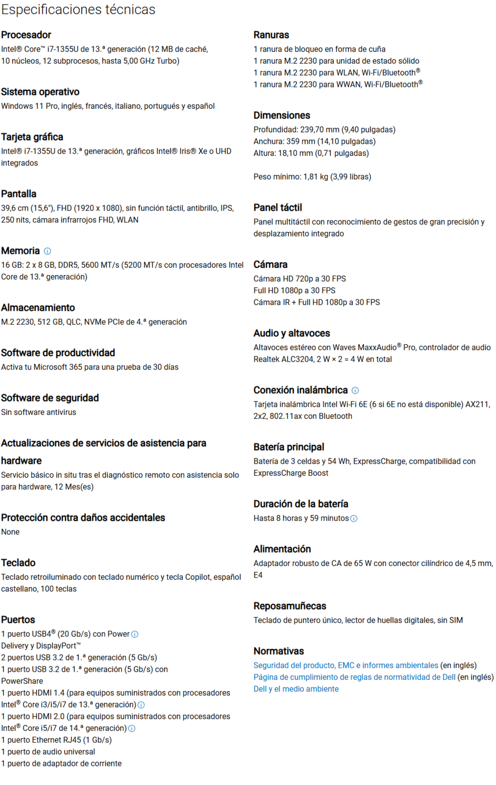 La Laptop Dell Latitude 3550 es un dispositivo diseñado para satisfacer las necesidades de los usuarios en entornos de negocios. Con una pantalla de 15.6 pulgadas y una resolución Full HD de 1920×1080 píxeles, ofrece una experiencia visual clara y nítida. Su procesador Intel Core i7-1355U, con una potencia base de 15 W y una frecuencia turbo máxima de 5 GHz, garantiza un rendimiento eficiente y rápido, ideal para tareas exigentes.