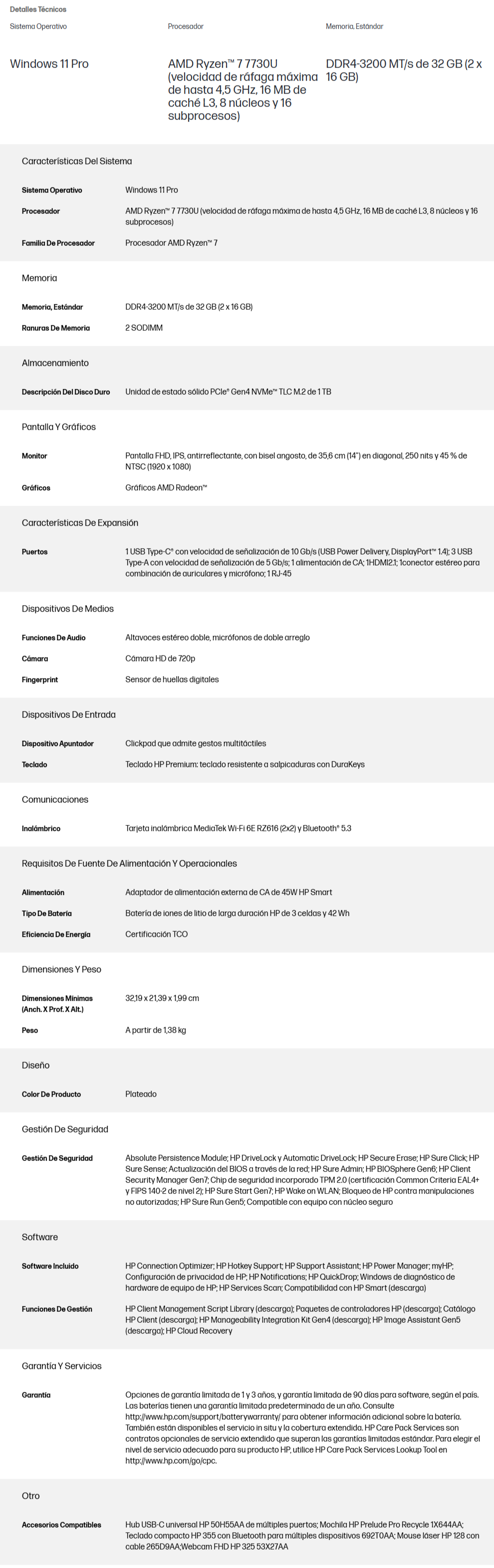 Laptop HP PROBOOK 445 G10 – AMD Ryzen 7 7730U, 14”, RAM 32GB DDR4 3200Mhz, Almacenamiento NVMe M.2 1TB, Windows 11 Pro – Gris