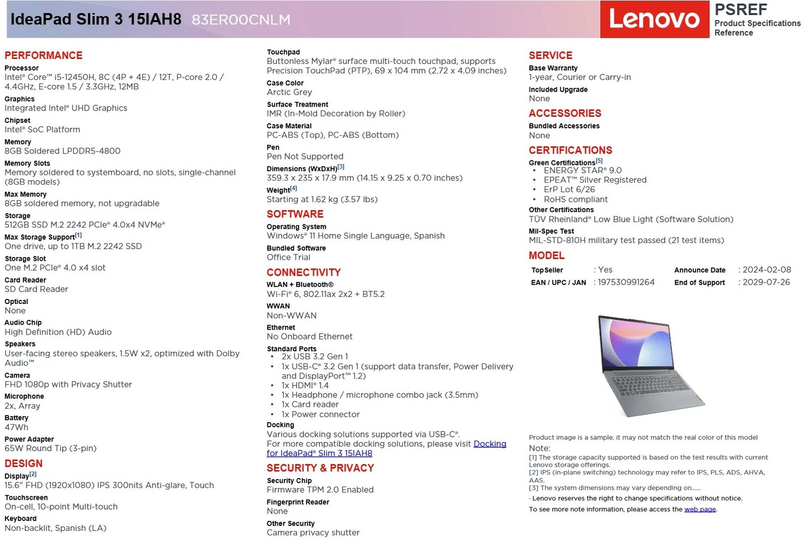 Laptop LENOVO IdeaPad Slim 3 15IAH8 – 15.6″,Intel Core i5-12450H, RAM 8GB, Almacenamiento NVMe M.2 512GB, Windows 11 Home – Español