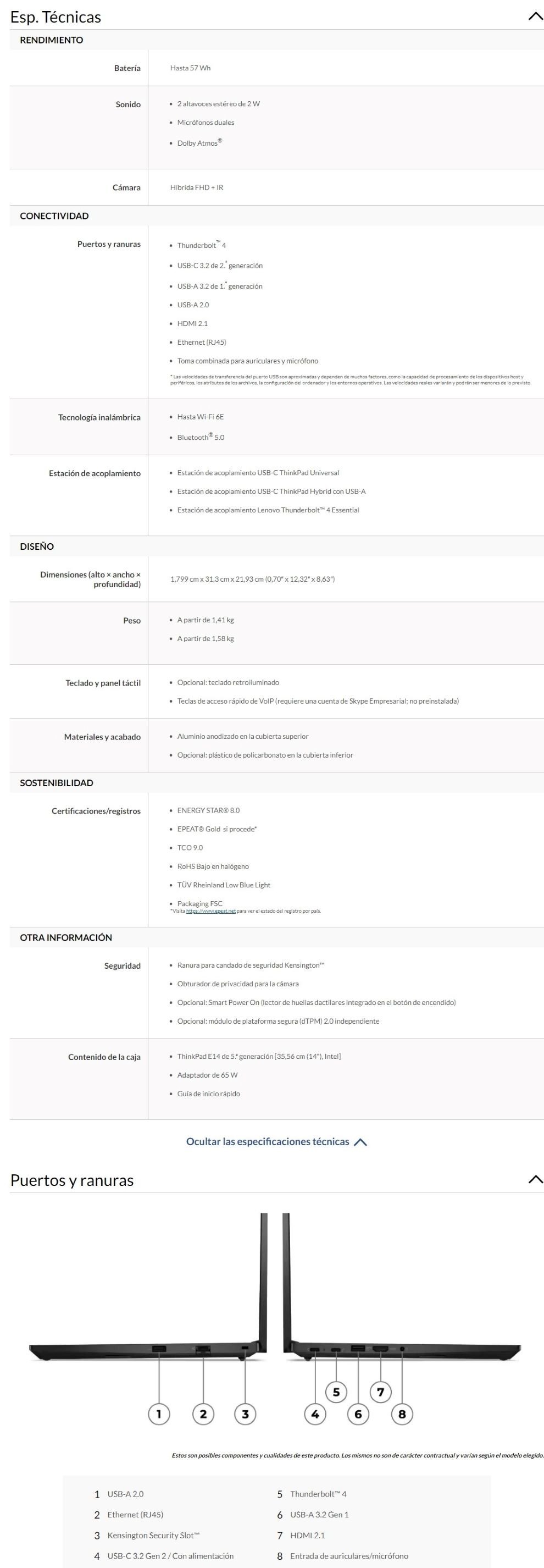 Laptop LENOVO ThinkPad E14 5ta Gen / 14″ IPS / Intel® Core™ i7-1355U / Memoria RAM 16GB DDR4 3200 MHz / Almacenamiento 512GB SSD M.2 / USB, USB-C, HDMI, RJ45, 3.5 MM / Windows 11 Pro 64 / Español / Color Negro