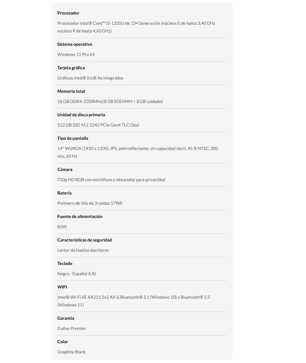 Laptop Lenovo ThinkPad E14 Gen 5 / 14″ WUXGA IPS Full HD / Intel® Core™ i5-1335U / Memoria RAM 16GB 2x8GB DDR4 / Gráficos Intel Iris Xe / 512GB M.2 SSD / Windows 11 Pro / Español / Color Negro