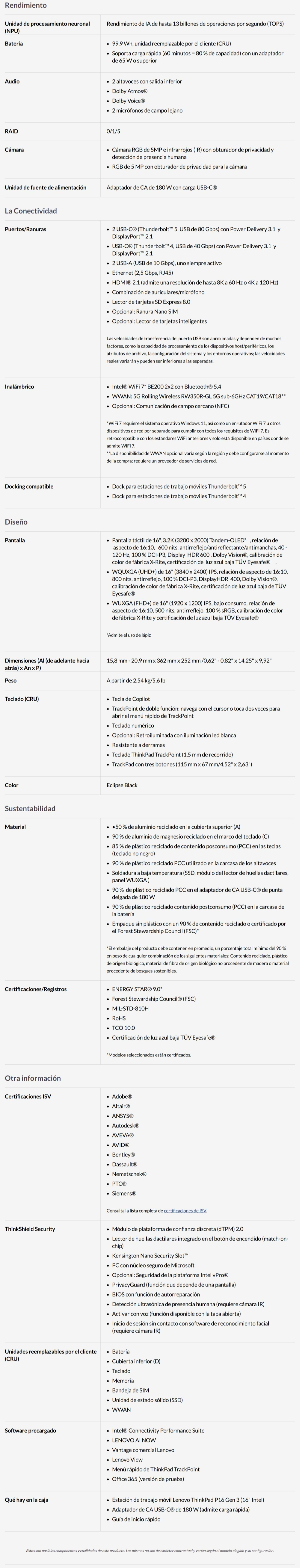 Laptop Lenovo ThinkPad P16 G3 – 16″, Intel CORE ULTRA 9 275HX, RAM 64GB DDR5, NVMe 2TB, NVIDIA RTX PRO 4000 – Windows 11 Pro, Ingles Negro