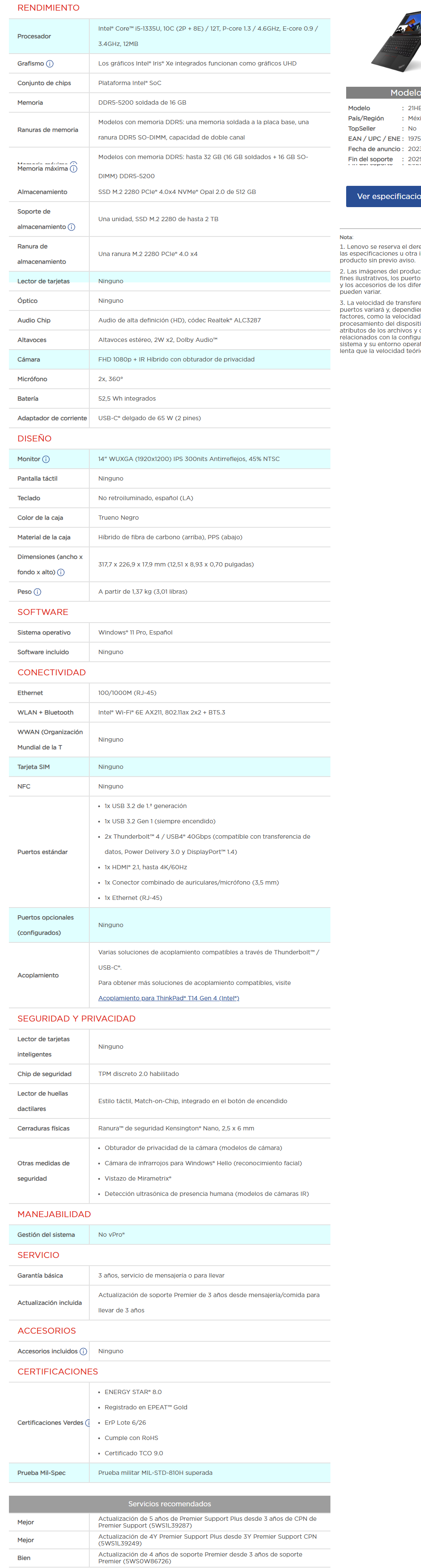Laptop LENOVO ThinkPad T14 Gen 4 / 14″ / Intel® Core™ i5-1335U / Memoria Ram 16GB / Almacenamiento 512GB SSD / HDMI, RJ45, USB 3.2 / Windows 11 Pro / Español / Negro