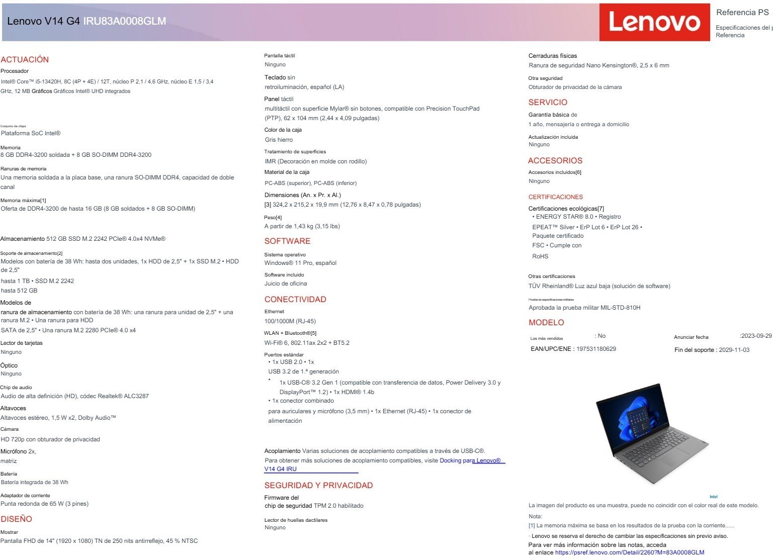 Laptop LENOVO V14 G4 IRU / 14″ / Intel® Core™ i5-13420H / 16GB (8GB soldados+8GB SO-DIMM) / Almacenamiento 512GB SSD / HDMI, RJ45, USB / Windows 11 Pro / Español / Gris