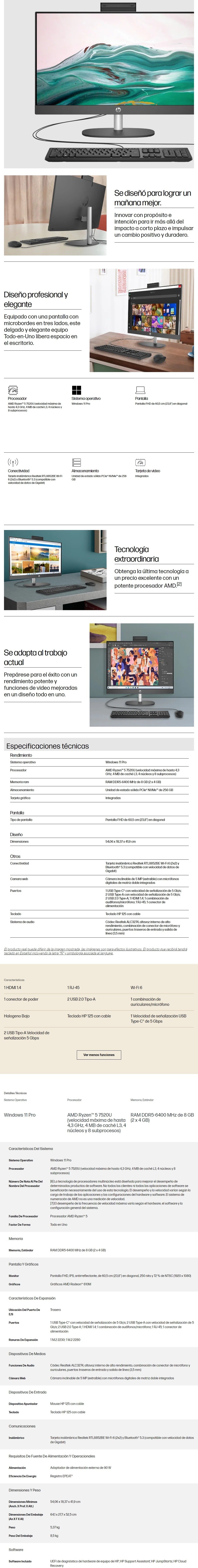 All in One HP ProOne 245 G10 / 23.8″ / Pantalla FHD IPS Antirreflejante / AMD Ryzen™ 5 7520U / 8GB DDR5 6400MHz / Almacenamiento 256GB SSD / USB, HDMI, RJ45, 3.5 MM / Windows 11 Pro / Español / Color Gris