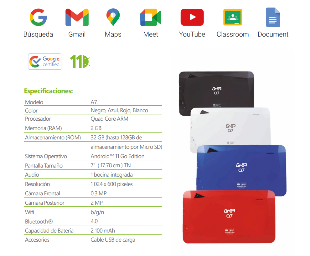 Diversion y estilo sin limites, con la nueva familia de tabletas a7 de ghia, android 11 go edition y un potente procesador quad core 1.5ghz , todo dentro de 7 pulgadas, asi de practica es la generacion a7
