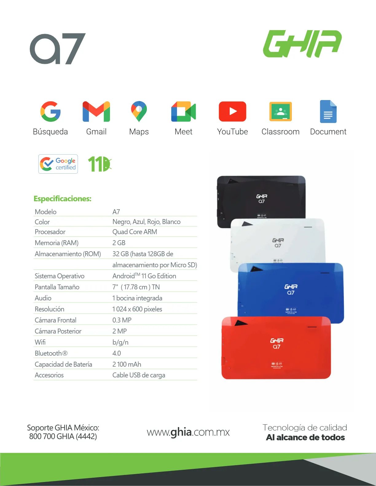 Tablet GHIA GA7133 / Quadcore Arm / 7″ / 2GB RAM / 32GB Almacenamiento / Cámara 0.3MP/2MP / Android 11 / Wifi / Bluetooth / Roja