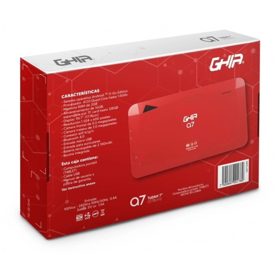 Tablet GHIA GA7133 / Quadcore Arm / 7″ / 2GB RAM / 32GB Almacenamiento / Cámara 0.3MP/2MP / Android 11 / Wifi / Bluetooth / Roja