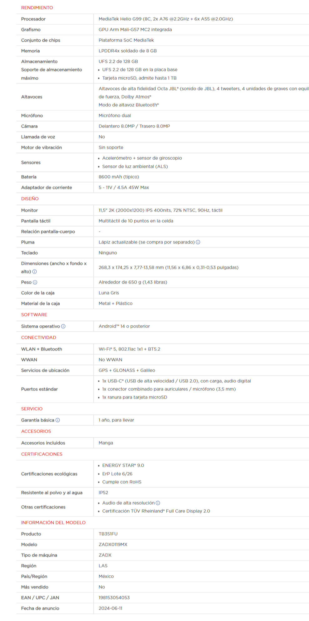 Tablet LENOVO TAB PLUS – MediaTek Helio G99, 11.5″, RAM 8GB Almacenamiento 128GB, Cámara 8MP/8MP, Android 14, Wifi, Bluetooth – Gris