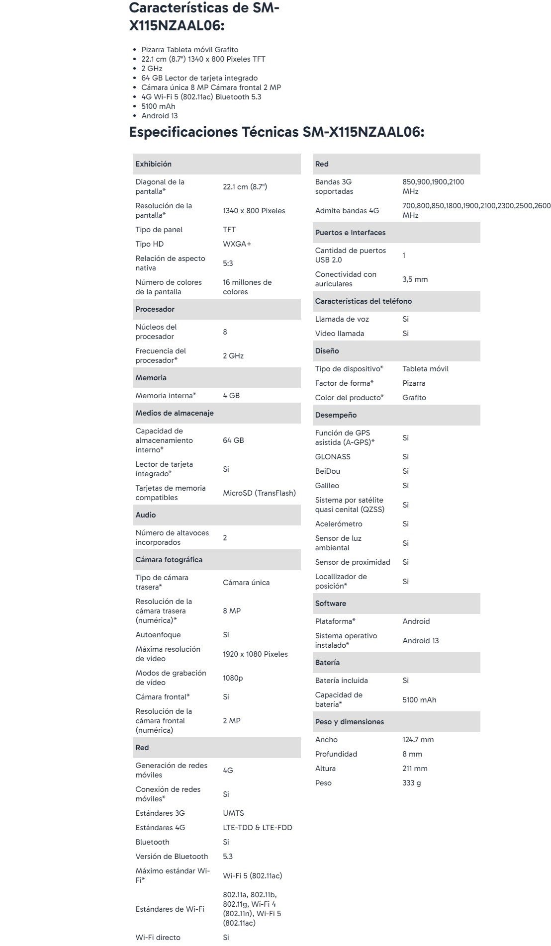 Tablet Samsung Galaxy Tab A9 LTE 8.7″ HD / Almacenamiento 64GB / 4GB De Ram / Android 13 / Compatible Con Red LTE-4G / 5100MAh / Color Gris