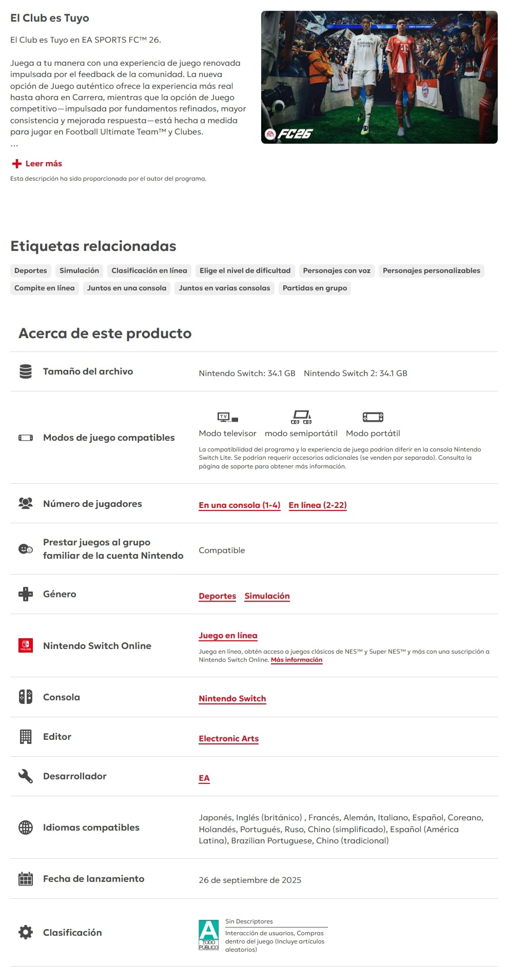 Sé el primero en valorar “Videojuego ELECTRONIC ARTS EA Sports FC 26, Nintendo Switch”