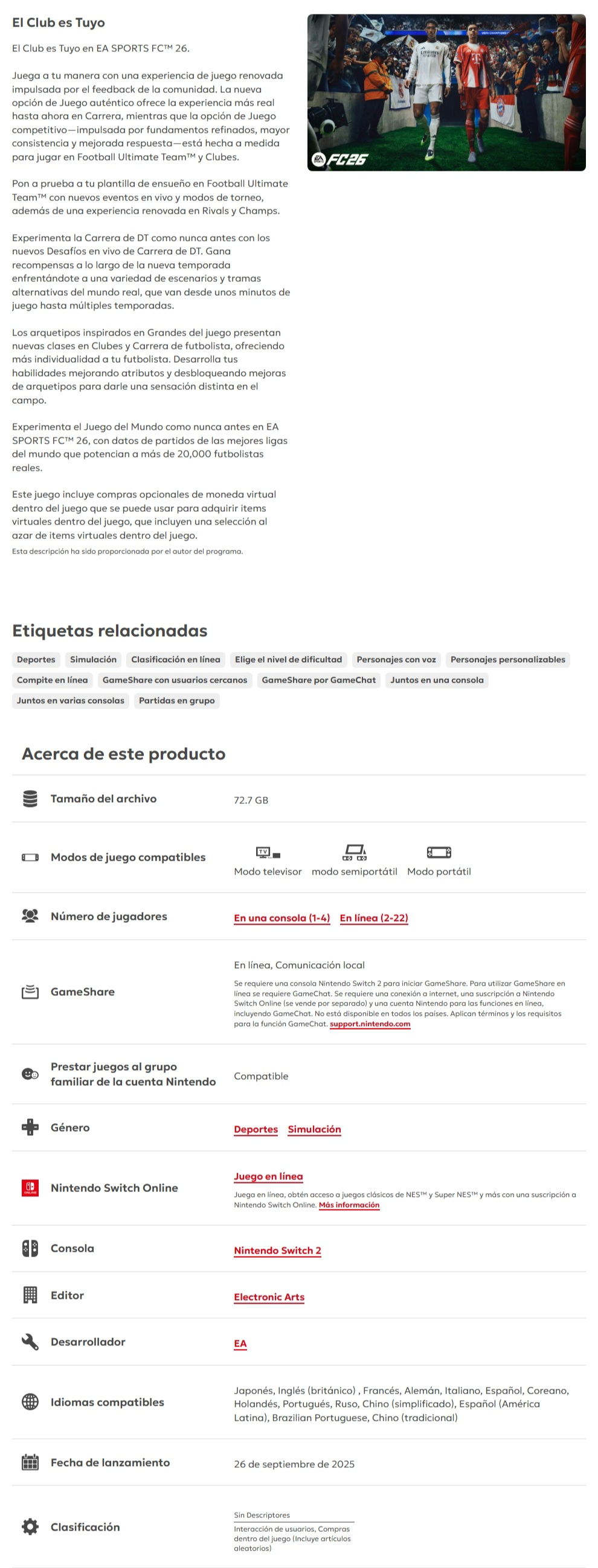 Sé el primero en valorar “Videojuego ELECTRONIC ARTS EA Sports FC 26, Nintendo Switch 2”