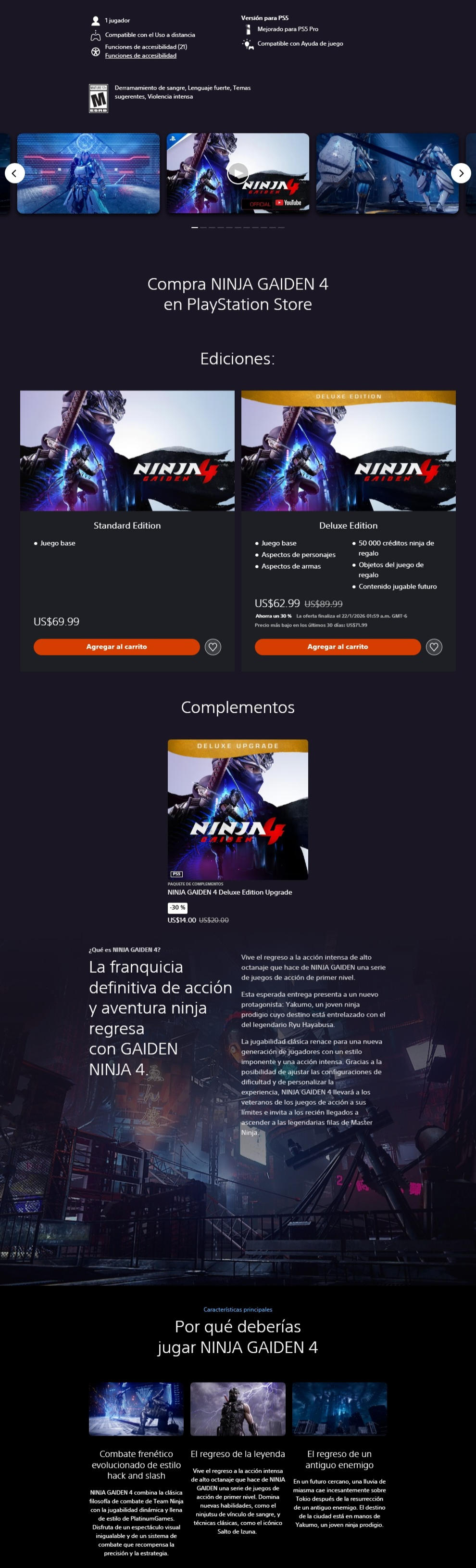 NINJA GAIDEN 4 para PlayStation 5 es un videojuego que continúa la famosa saga de acción y aventura. Este título ofrece una experiencia de juego intensa y dinámica, caracterizada por su jugabilidad fluida y gráficos de alta calidad, aprovechando al máximo las capacidades de la consola.