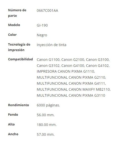• Compatibilidad: Canon G1100, Canon G2100, Canon G3100, Canon G3102, Canon G4100, Canon G4102, IMPRESORA CANON PIXMA G1110, MULTIFUNCIONAL CANON PIXMA G2110, MULTIFUNCIONAL CANON PIXMA G4111, MULTIFUNCIONAL CANON MAXIFY MB2110, MULTIFUNCIONAL CANON PIXMA G3110