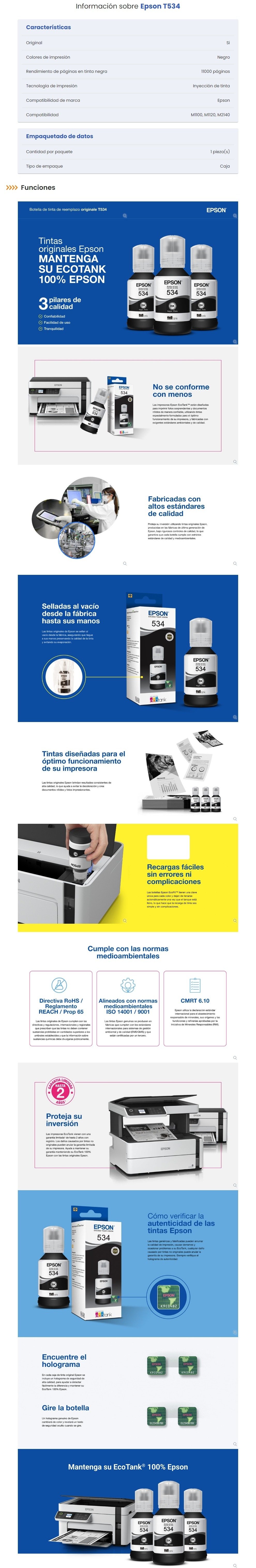 Botella De Tinta EPSON T534 / Rendimiento 11 000 páginas / 120 ML / Compatible Con M1100, M1120, M2140 / Original / Color Negro