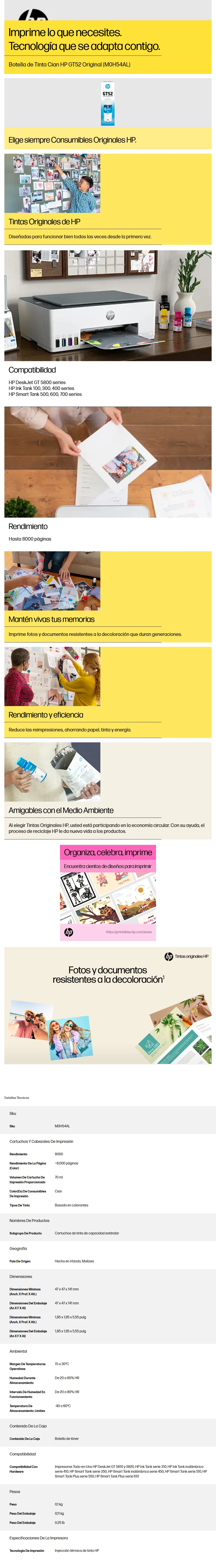 Botella De Tinta HP Original M0H54AL Gt52 / Cyan / Rendimiento 8000 Paginas / 70Ml / Negro