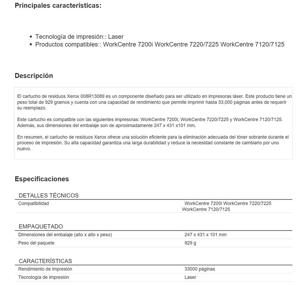 El cartucho de residuos Xerox 008R13089 es un componente diseñado para ser utilizado en impresoras láser. Este producto tiene un peso total de 929 gramos y cuenta con una capacidad de rendimiento que permite imprimir hasta 33,000 páginas antes de requerir su reemplazo.