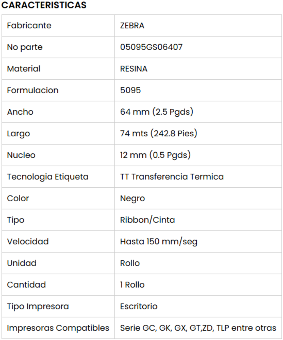 Cinta ZEBRA De Resina 05095GS06407 / 64 MM X 74 M / 12 Rollos Por Caja / Núcleo De 0.5″ / Alto Rendimiento / Color Negro