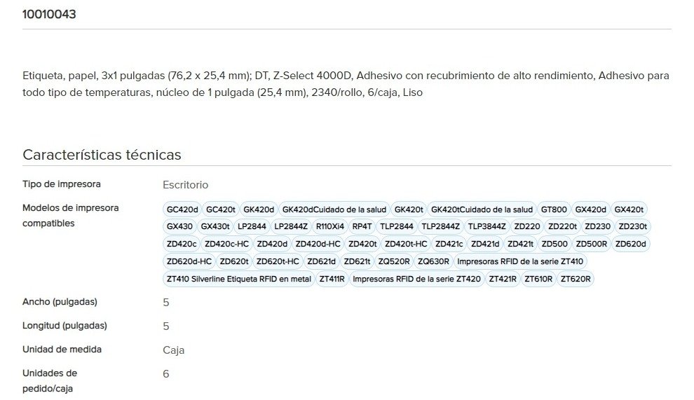 Etiquetas ZEBRA Z-Select 4000D / 3X1 Pulgadas / Núcleo 1″ / 2340 Por Rollo / 6/Caja / Blanco