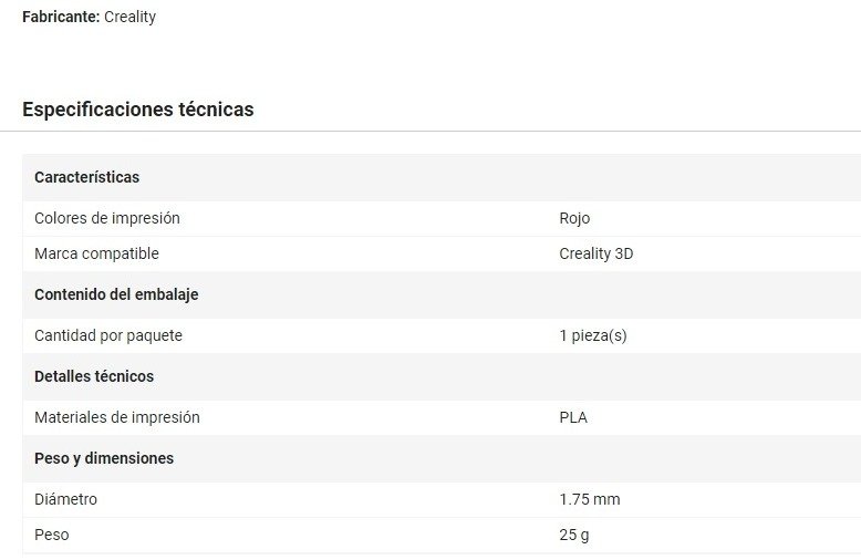 La Creality Bobina de Filamento PLA 250g Rojo es un producto diseñado para la impresión en 3D. Esta bobina cuenta con una longitud de filamento de 1.75 mm y está fabricada a partir del material Ácido poliláctico (PLA), el cual se caracteriza por ser biodegradable y no tóxico